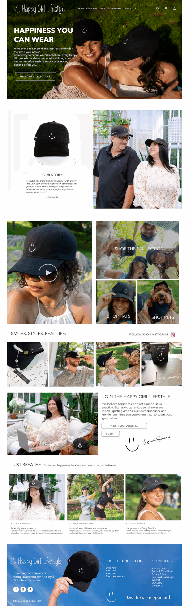 Happy Girl Lifestyle celebrates joy, self-love, and empowerment through fashion. The client needed a site that showcased their mission, origin story, and designs while creating a simple and visually appealing shopping experience.